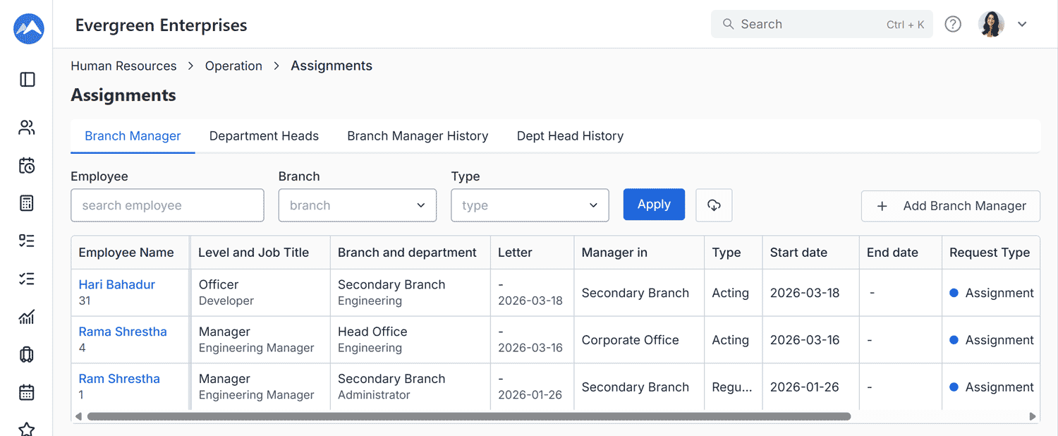 Branch Manager, Department Manager and Acting, Deputation and Assignments Tracking
