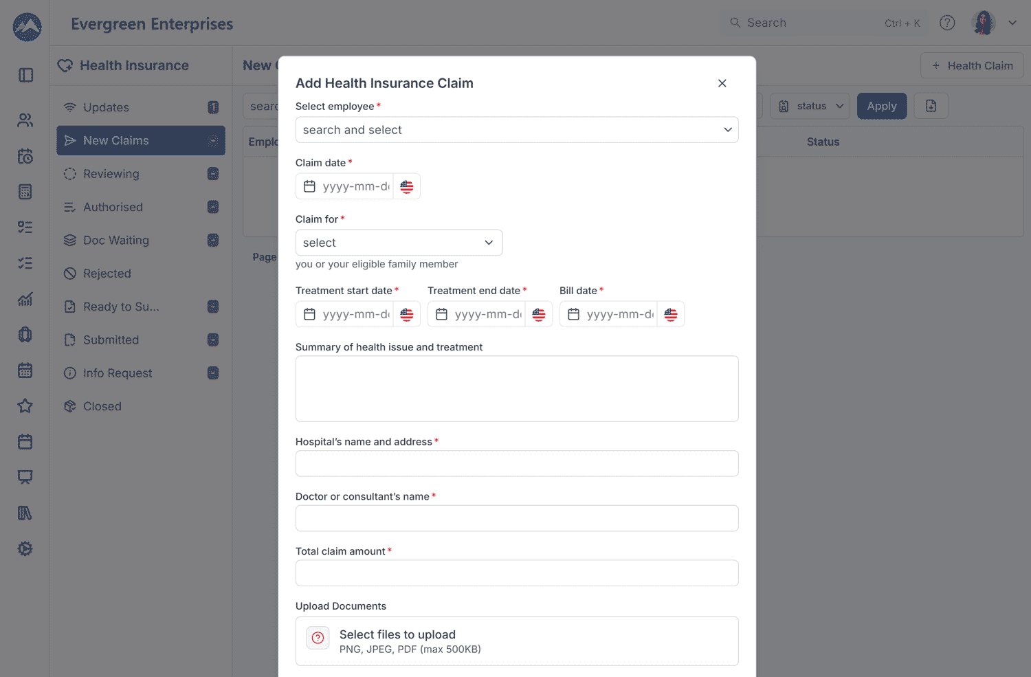 A completely new insurance claim module has been added which replaces the old Insurance Claim feature. The new insurance module is easier and efficient to work with and now it has two way communication with employees and insurance claim department.