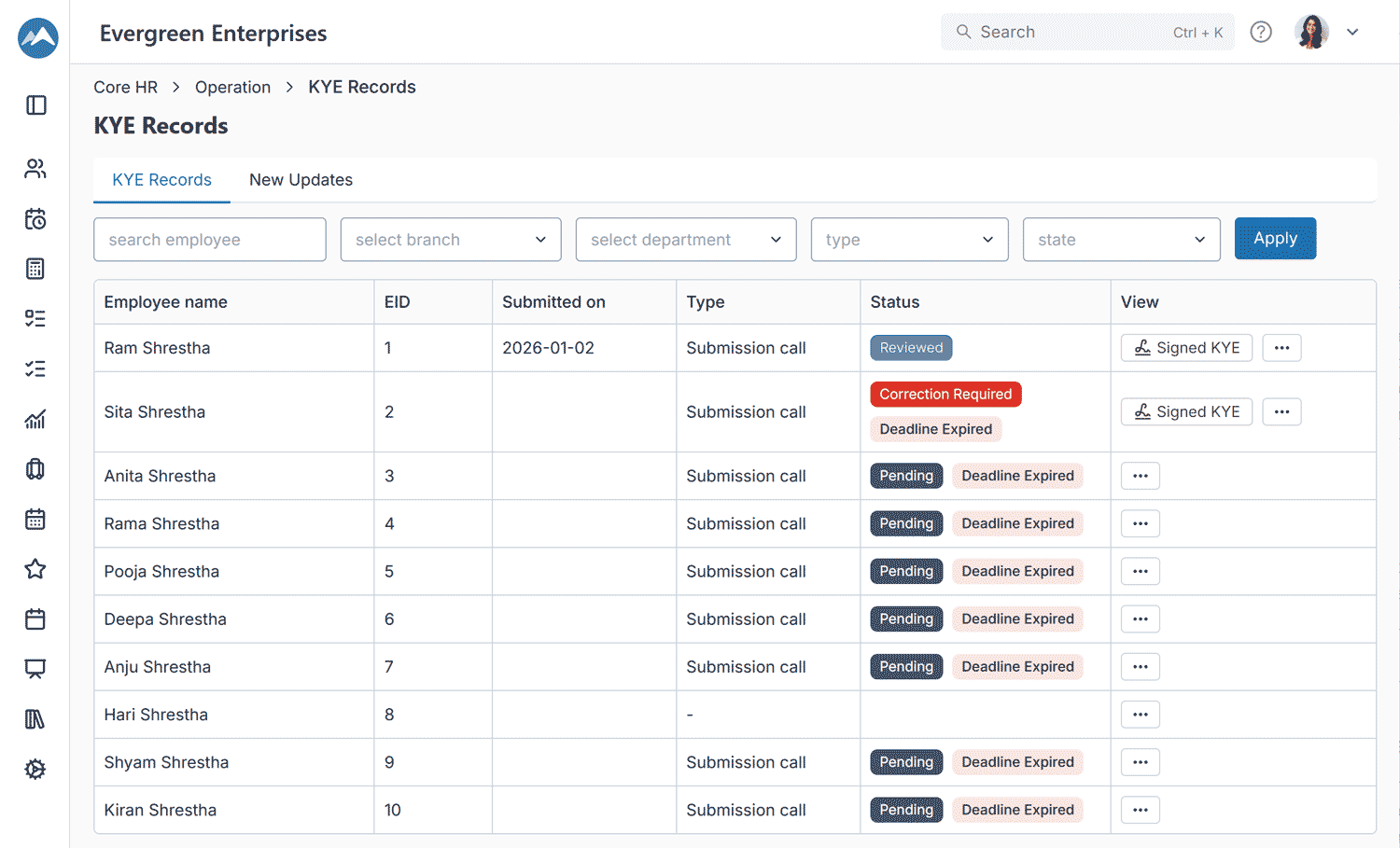 A new feature Know Your Employee (KYE) has been introduced. It helps organizations (mainly financial institutions and large-scale enterprises) to keep their employee record up to date via employee self-service portal.