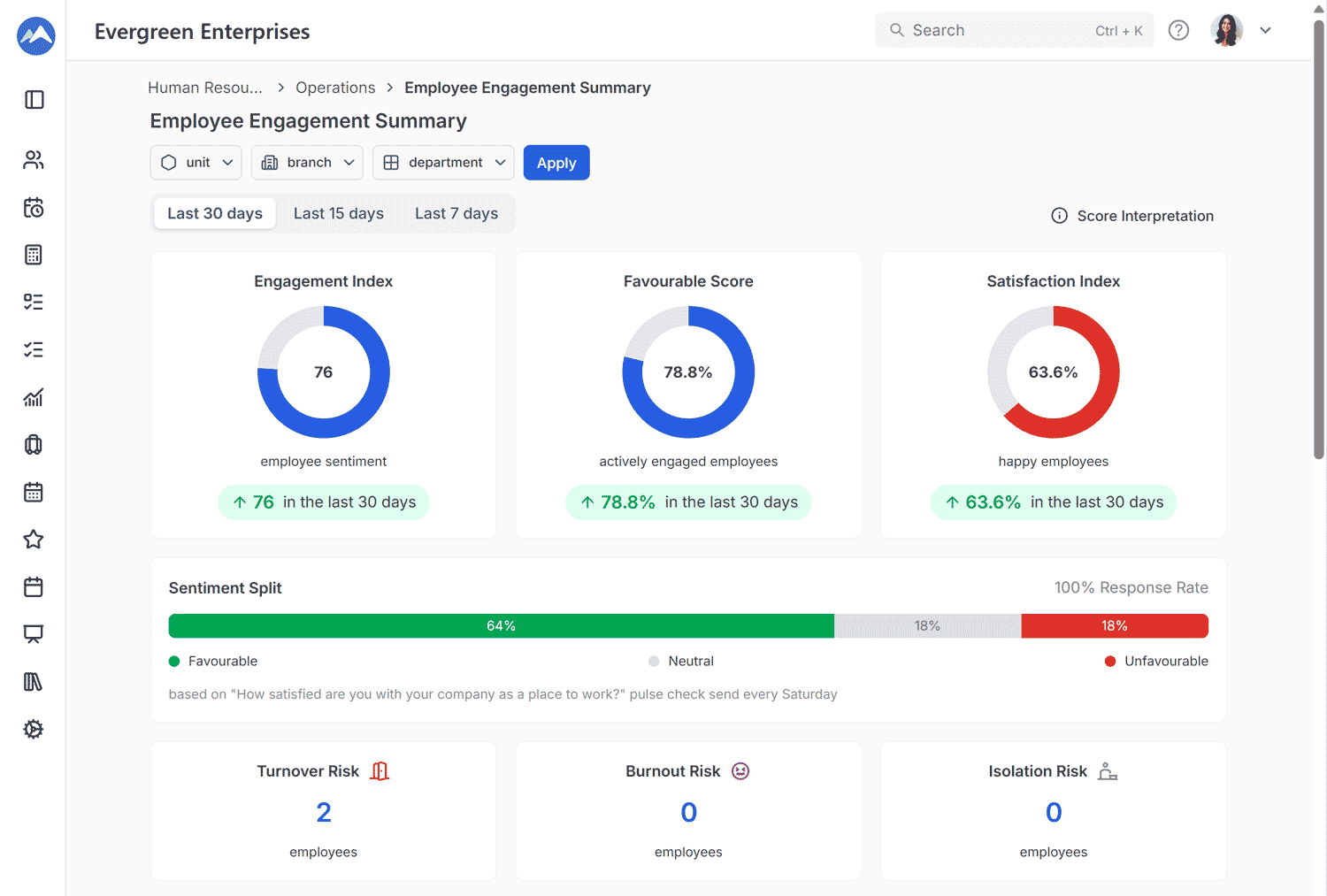 With pulse survey we have taken the employee feedback and engagement system one step further. Pulse survey sends weekly pulse check prompts to employees automatically and tracks employee sentiment, happiness and engagement. Based on the pulses, it shows engagement, satisfaction and happiness scores and indices and even gives you recommendations on how to elevate employee experience and engagement. Pulse survey also checks for turnover, burnout and isolation risk so that you can solve the issue before it is too late. Along with grievance handling and employee feedback, it helps to make the workplace happier and healthier.