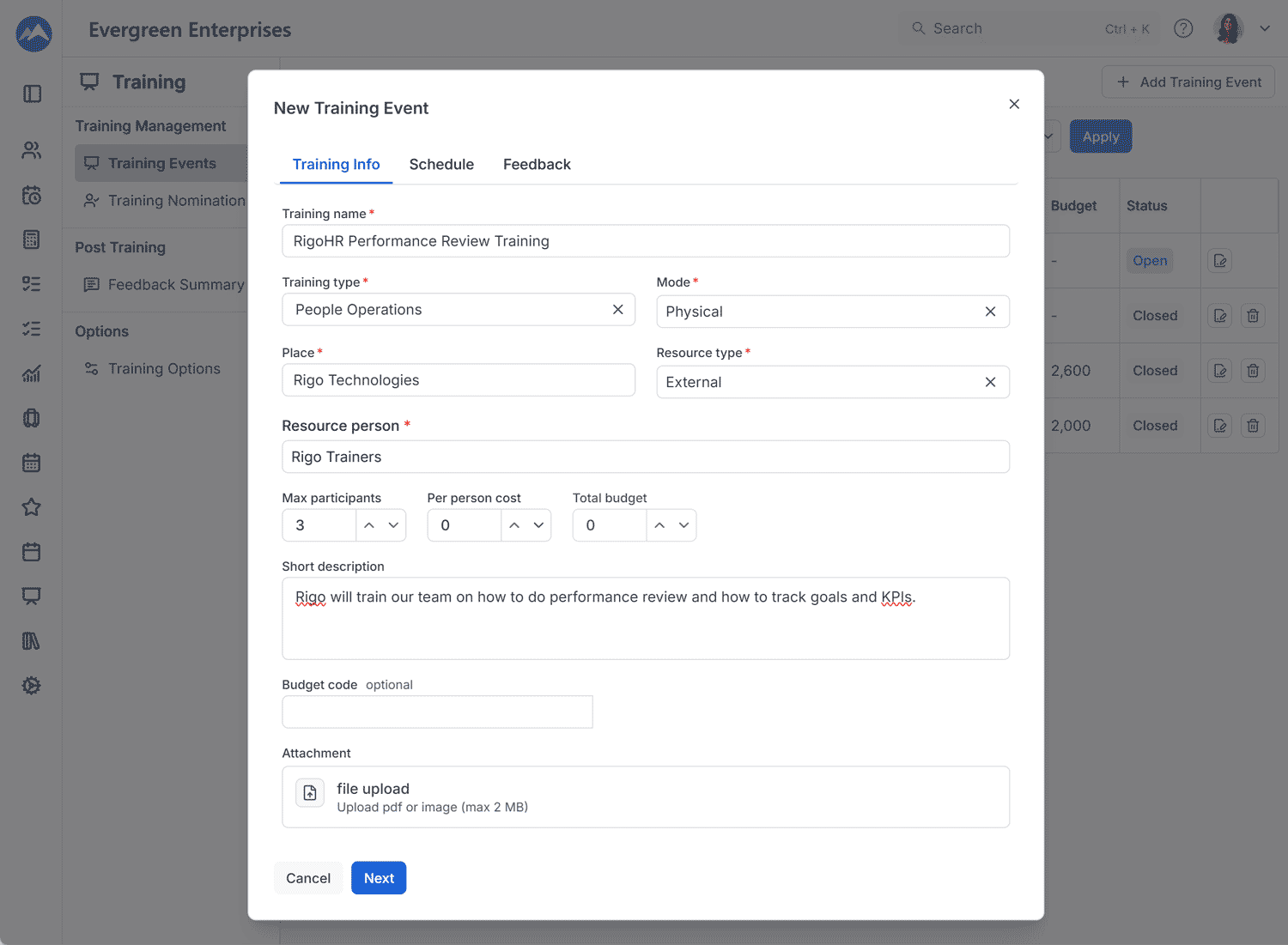 Training management module has been updated to make it easier and better. You can plan training, add training events, notify employees, track participation and receive training feedback. There are some more features on the way to the next release.