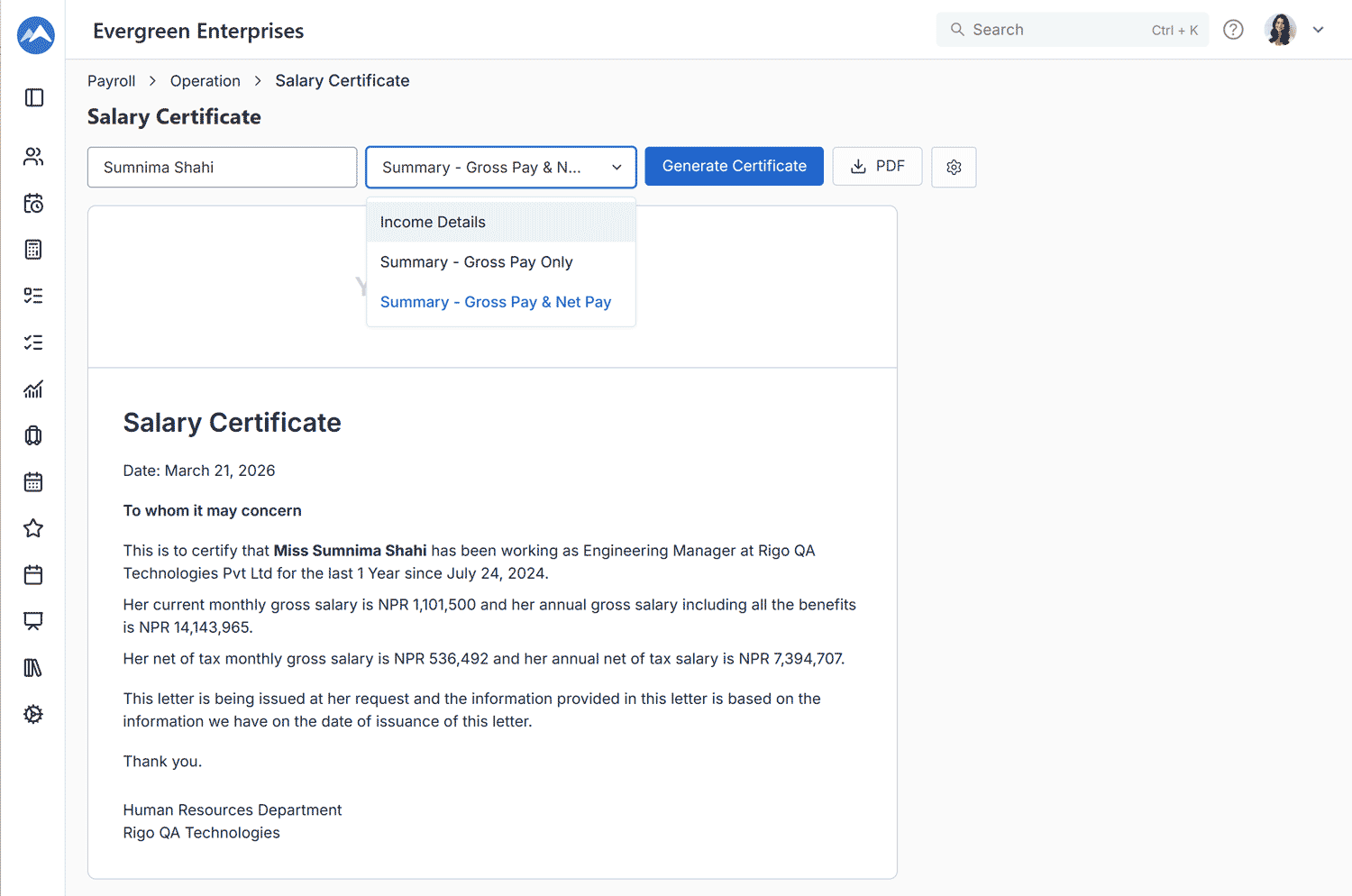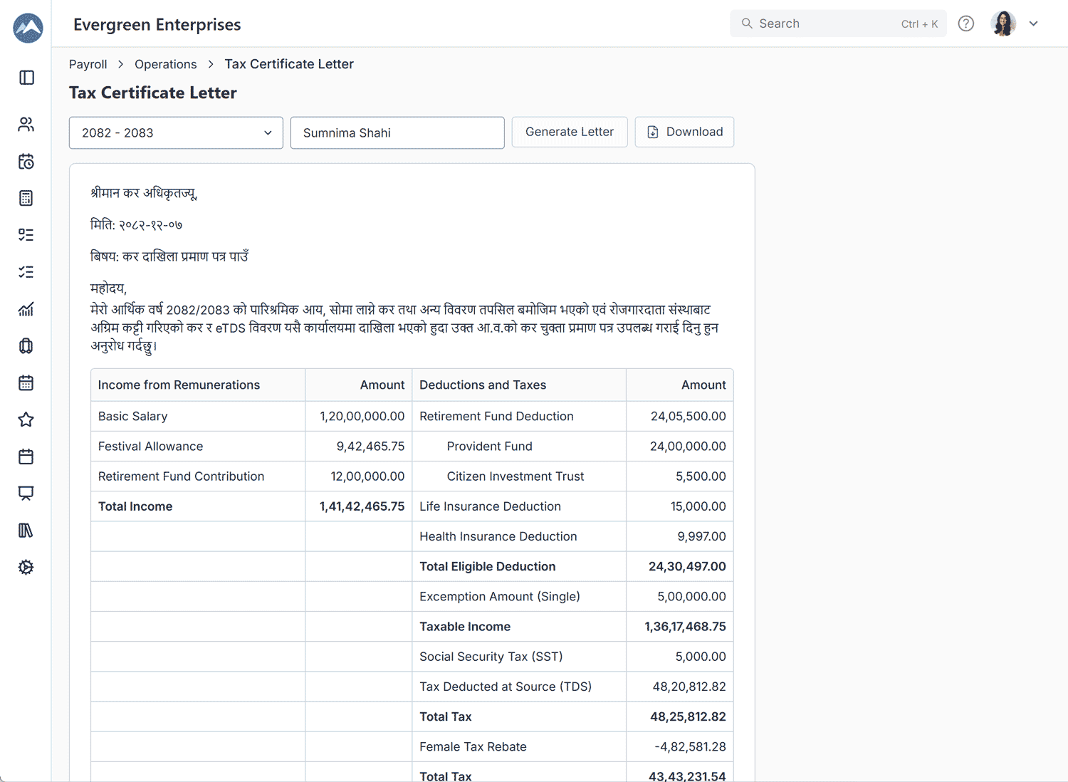 We have added new Tax Certificate Letter with greater flexibility. And three different formats of Salary certificate letters have been added. You can select the level of details you want in the Salary Certificate based on the letter purpose. You can also design your own Salary Certificate letter from Additional Letter Generation Feature.